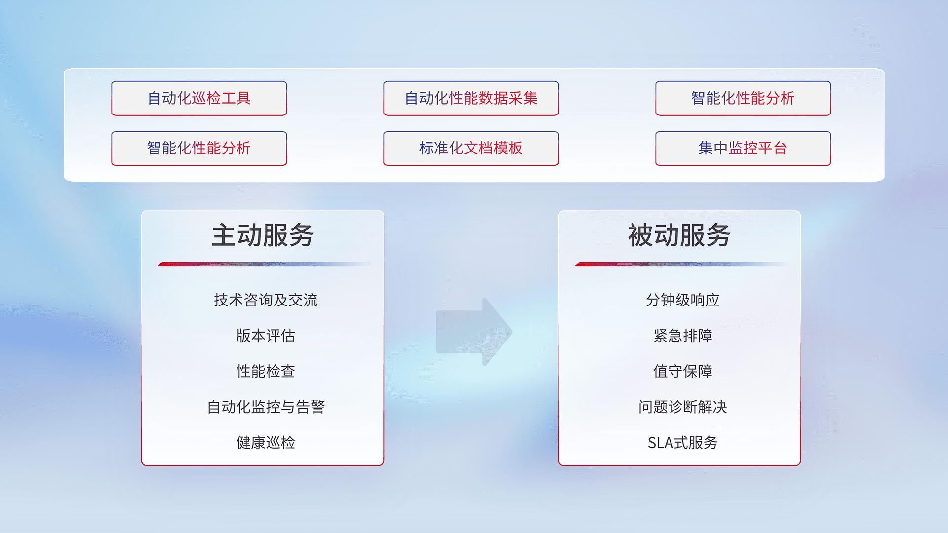 智能化工具和标准化文档,,保障服务质量,,,提供主动服务(包含技术咨询、、版本评估、、、、性能检查、、、自动化监控与告警、、、、健康巡检)和被动服务包含(分钟级响应、、、、紧急排障、、值守保障、、问题诊断解决、、SLA服务)。。。